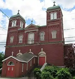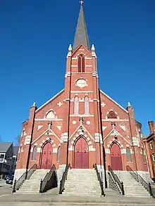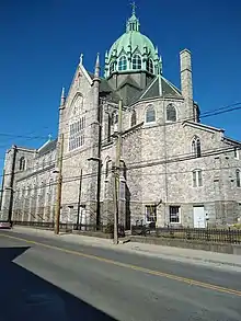Saint Anne Church, formally the Shrine of Saint Anne for Mothers, is a Roman Catholic church located in the South End neighborhood of Waterbury, CT, part of All Saints Parish (Spanish: Todos Los Santos). Saint Anne Parish was founded in 1886 to serve city's the French-Catholic population. For nearly 100 years, two 100 foot steeples served as a prominent Waterbury landmark; however, due to ongoing structural problems, the spires were carefully removed in 2019 and stored for possible reconstruction.