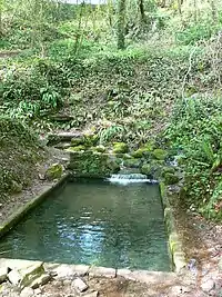 During this time, various structures were built around the well and bath to accommodate the many pilgrims. Browne Willis wrote in 1721 that there were rooms for changing into bathing clothing and other buildings; one was said to be a chapel which had images of the 12 Apostles in its lower half.[14][19][26] Thomas Pennant said the fountain was "inclosed in an angular wall decorated with human figures and before it is the well for the use of the pious bathers".[27][28][lower-alpha 5] In later times the well and its surroundings fell into neglect. Richard Fenton's 1808 visit to the well found that the building which formerly enclosed the bath had fallen in and was ruined with the "bath choaked up".[25][24] By 1880 little evidence of the former buildings on the site remained.[18] Attempts were made to revitalise the site; some bridges were built over the stream and small statues were again brought to the area surrounding the well.[3] The well remains a popular place for pilgrims; some churches have visited the well to conduct baptisms using the water of the well.[3] The site of the well was named a Grade II Listed Building in the National Historic Assets of Wales, on 29 November 1999.[24]