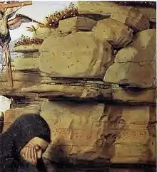 Van Eyck's meticulous setting and landscape were another innovation in iconography. Generally La Verna was depicted with sparse detail, whereas here St Francis kneels in a detailed countryside, perhaps a specific spot around La Verna in the Italian Apennines, where striated sandstone is commonly found. The setting is appropriately remote.[43] St Francis appears to stare beyond the vision to the rocks, seemingly unaffected, a common Eyckian device to illustrate a mystical vision. For example, in his Madonna of Chancellor Rolin it is difficult to tell whether the location is Mary's throne-room or whether she is merely an apparition in Rolin's chamber – one he seemingly stares past.[44]