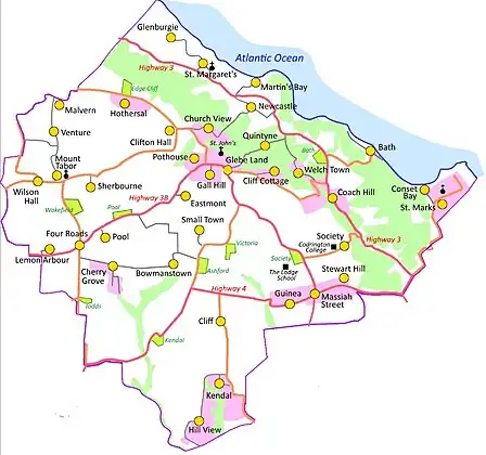 The center of Saint John is at Gall Hill and Glebe Land on Highway 3B. Gall Hill is the home of the Gall Hill Community Center and the Gall Hill Pavilion.[4] There are shops and restaurants on main street. Glebe Land is the home of St. John's Primary School and the David Thompson Health and Social Services Complex.[5] The Parish Church is a little north of Highway 3B.