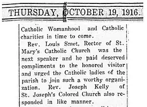 By the turn of the 20th century, Black Catholics at St. Mary's were served by their own priest, Rev. Charles Hannigan of the Josephites, a Catholic society whose mission it was to serve the needs of Native and African-American communities.[6] He traveled from Richmond each week to conduct Mass for the Black Catholics of Alexandria.[7]