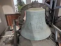 The 42" 1,320 lbs. bronze church bell, cast by the Meneely Bell Foundry of West Troy, New York in 1905 and outfitted by The Verdin Bell Company of Cincinnati, Ohio in 1964, is rung weekdays at noon Angelus, but otherwise is not normally rung due in part to the close proximity of neighbors' homes,[6] and due also in part to the adverse effects the tolling of the bell may have upon the organ pipes, which share the common rear wall of the building.