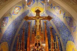 The crucifix hanging from the dome of the apse is 10 feet wide and 12 feet long, with a symbol representing one of the four Gospels at each extremity. Created by a parishioner, it was first hung in the church during the early 1930s.[2]