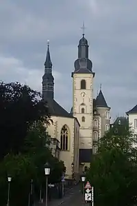 The church is the oldest extant religious site in Luxembourg City.[1] The first church was built on the spot in 987 as the castle chapel for the Count of Luxembourg. However, over the following centuries, the building was destroyed, rebuilt, and renovated several times. Its current appearance dates to 1688, and unites Romanesque and Baroque architectural styles, pre-dating the national Moselle Baroque style.[1] The building has been restored since then, preserving its original form; it has most recently been renovated in the 1960s, 1980s, and 20032004.[1]