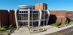 Saint Michael Catholic High School officially opened its doors on September 5, 1989 in its original location on 6009 Valley Way. The year prior it was Lord Elgin High School and was administered by the now District School Board Of Niagara.[1] At that time the school had 248 students, including over 50 students that transferred from Saint Paul Catholic High School. The current Saint Michael building opened on April 16, 2004, after the original building fell into disrepair; the new building originally housed 800 students. Today 6009 Valley Way is occupied by The Gate Alliance Church. The only thing that remains of the old faculty is the lockers, gym and the white cross that was installed in 1989. From the years 2012-2015 the new location was renovated for the construction of an addition that added more indoor classrooms to replace portable classrooms that required students to go outside to get to their classes. This expansion cost a total of 6.1 million dollars. Today Saint Michael offers almost 170 courses for students to choose from.[2] This includes four high skills major programs in transportation, hospitality and tourism, construction, and horticulture & landscaping.