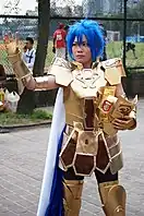 Several cosplays of the characters from Saint Seiya: Hades. From left to right: Seiya, Saori and Saga.