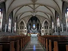 It was built in 1866 and added to the National Register in 1983. The Church was built by local Italian-Americans who immigrated to this country in the mid to late 1800's. Many Italianate features that can be detected in this church, are the many statues, the Stations of the Cross which were built in Italy, the Altar which is made of marble from Italy, and the intricate stain glass windows on the sides of the church, as well as the five behind the altar depicting, from L-R, St. Peter, The Last Supper, The Risen Christ, The Crucifixion, and St. Paul. University of Notre Dame football coach, Knute Rockne, was married in this church in 1914.[3]