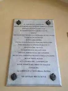 In subsequent meetings, which always took place in the "hall of the congress centumvirate" of Reggio, many decisions were decreed and formalized, including the choice of the emblem of the newly formed republic.[13] To put forward the proposal for the adoption of a green, white and red national flag was Giuseppe Compagnoni — who for this reason is remembered as the "father of the Italian flag" — in the XIV session of the congress cispadano[14] of 7 January 1797.[13][15][16] The adoption decree states:[14][17][18]