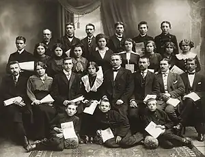 Back in 1904, Banaitis joined the Daina Society which organized music and theater performances.[8] In 1915, Banaitis organized Kaunas chapter of the Lithuanian Society for the Relief of War Sufferers and became its vice-chairman.[25] In early September 1915, Banaitis managed to obtain a permit for a Lithuanian gymnasium (present-day Aušra Gymnasium).[26] With financial help from the Lithuanian Society and resources of the educational Saulė Society, Banaitis organized the new school – located the premises, obtained supplies, and recruited students and teachers.[27] The school opened by the end of 1915 with about 60 students.[28] Banaitis' son Bronius was among its students and graduated in spring 1919 while another son Kazimieras Viktoras was one of the first teachers.[29] Saulė Society soon took over the school administration. Banaitis further established 12 elementary schools and was their inspector.[30] In late 1915, he also organized bookkeeping courses. He and four others taught 20 students for four months.[31]