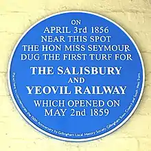 The line opened in three stages. From a new Fisherton station in Salisbury to Gillingham on 1 May 1859; from there to Sherborne on 7 May 1860, and finally to Yeovil on 1 June 1860.[1] It used the Bristol and Exeter Railway’s Hendford station until a new joint Yeovil Town railway station was opened on 1 June 1861.[2] In the meantime, the LSWR's line from Bradford Abbas Junction to Exeter Queen Street had opened on 19 July 1860. Although initially just a single track with passing loops at stations, work started in 1861 to double 2+1⁄2 miles (4 km) westwards from Salisbury, and 4 miles (6 km) east from Sherborne. The whole route was doubled within ten years.[3]