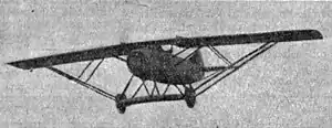 It was noted at the time that the wings were very thin and so required elaborate struttage which also involved the fixed landing gear. The central part of the latter was a wooden airfoil section, 3 m (9 ft 10 in) span plane which contributed an extra 13% lifting area. This had metal carriers at its tips, each supported by a pair of almost parallel struts to the lower fuselage. Split axles, mounted centrally on a transverse V-strut from the fuselage, were connected to the carriers via rubber shock absorbers and mounted the wheels. The main wing struts converged slightly from the carriers to the wing longerons at about 80% span. From near the midpoint of these struts a further pair of inverted Vs braced the inner wing to the upper fuselage.[4]