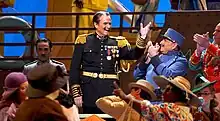 At the port, crowds gather in preparation of the re-christening of the ship "The Invincible". Sergeant Guzmán introduces General García, who steps up to the podium. The general announces that they are declaring war on Nazi Germany and that the ship will be used to defend the island. Ulises and Chucho step onto a platform behind the military band in preparation for the performance. After the general’s speech, the frigate begins to move from the dock. The two performers quickly realize the platform is attached not to land but to the ship, and that they are sailing off to sea.