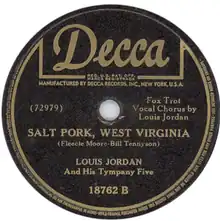 "Salt Pork, West Virginia" is a song attributed to Fleecie Moore and William J. Tennyson Jr., performed by Louis Jordan and his Tympany Five, and released on the Decca label (catalog no. 18762-B). It peaked at No. 2 on Billboard's race record chart and remained on the chart for 15 weeks.[1] It ranked No. 8 on the magazine's list of the most played race records of 1946.[2]