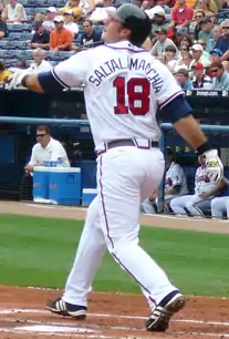 With both starting catcher Brian McCann and backup Brayan Peña injured during a game against the Philadelphia Phillies, Saltalamacchia was called up to Atlanta on May 2, 2007, his 22nd birthday. He made his MLB debut that same night, getting on base twice with a walk and a hit by pitch.[13] Four days later, Saltalamacchia recorded both his first major league hit and RBI in a 6–4 win over the Los Angeles Dodgers. The latter hit, which came off of a pitch from Saltalamacchia's childhood friend Chad Billingsley, helped bring home Andruw Jones to give the Braves the lead.[14] His first home run came on May 27, with a solo shot off of the Phillies' Cole Hamels.[15] Exactly one month later, while filling in at first base to make room for McCann behind the plate, Saltalamacchia recorded his first multi-home run game, with third- and fifth-inning solo shots against Mike Bacsik of the Washington Nationals.[16] In 47 major league games with Atlanta, Saltalamacchia batted .284 with four home runs and 12 RBIs in 141 at-bats.[17]