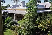 The southern section has two parallel hipped sections, with a flat roofed section between, surrounded by a recent verandah with a curved corrugated iron awning and timber details to match the earlier section.[1]