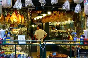 A salumeria is a food purveyor and retail store that produces and sells salumi, which are meat products of Italian origin that includes sausages, cold cuts and other foods predominantly made from pork.[1][2] Some salumerias also produce some beef-based products, such as bresaola, a salted beef product, and purvey other food products such as pasta, cheese, preserved foods, anchovies, salt cod, wines, bread and cooked meats.[2][3][4] Some modern salumerias only sell salumi and related products, while not producing products on-premises. Some salumerias also operate sit-down restaurants, such as Sorriso Italian Salumeria in Queens, New York City.[5] Salumeria Biellese is another salumeria in New York City that is well-known, and was established in 1925.[6]