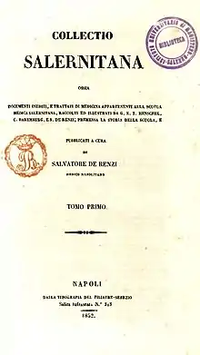 - Collectio Salernitana ossia Documenti inediti e trattati di medicina appartenenti alla scuola medica salernitana raccolti e illustrati da G. E. T. Henschel, C. Daremberg e S. De Renzi; premessa la storia della scuola e pubblicati a cura di S. De Renzi medico napolitano, Sebezio, Naples 1852