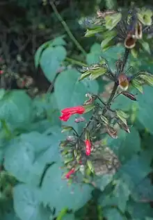 Salvia orthostachys is a perennial shrub endemic to Colombia, growing in dry country on roadsides, rocky banks, and stony bushland. The plant reaches up to 1.5 m (4.9 ft) high, with leaves that are hairy on both surfaces. The red flower is up to 2 cm (0.79 in) long, with a short upper lip.[1]