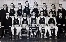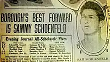 While attending Columbia's Teachers College in Manhattan, NY, "Sammy", played forward on the varsity basketball team alongside Lou Bender and George Gregory.[1][7] Although mediocre his sophomore and junior year, by Schoenfeld's senior year with the addition of Lou Bender, the team won the Ivy League championship in 1930. It was the first coast to coast radio broadcast of a college basketball game over 45 stations nationwide. Columbia won the game. He and Bender were named first team All-Ivy League. He graduated in 1931.[7][2]