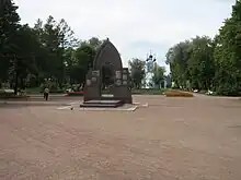 Former 18th-century St Sampson's Cathedral churchyard (now a public garden) facing Lesnoy Prospekt avenue with the vandalised in 2000 bronze and granite monument set up in 1995 by the Russian emigre artist Mikhail Shemyakin and architect Vyacheslav Bukhayev (Rus. Вячеслав Бухаев) to First-builders of Saint Petersburg (ru:Первостроителям Санкт-Петербурга) - especially the European architects who designed city's 18th-century layout and landmarks and were buried in this ground. Bronze details such as the full-scale models of drawing desk with memento mori (skull), candlestick, 17th-century Dutch chair and wall tablets already stolen. The granite wall with its Gothic arch typical of European architecture, but not Russian, was designed as a wall of an architect's studio with "a window on Europe".[9] Original look on Yandex Images.