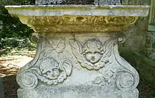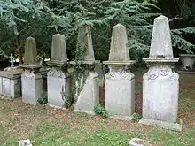 Grove is buried at St Mary's among a group of family graves that are grade II listed monuments with Historic England.[6] Each has a similar cherub head ornament surmounted by an obelisk. The deaths span the years 1755 to 1861. The grave stones (from left to right in picture) and years of death are 1) Rev Dr Francis White 1755, 2) Miss Martha Grove 1794 and John Grove 1861, 3) John Grove 1819, Mrs Elizabeth Grove 1825, and Mrs Martha Jaques 1849, 4) Rev Samuel Grove 1769, 5) Mrs Martha Grove 1789, 6) W.P. Ashurst 1773 (not pictured).[7]
