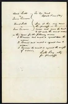 In 1847, Dred Scott made his first legal contest for freedom in St. Louis, Missouri. Judge Alexander Hamilton presided over the case and Samuel M. Bay acted as Scott's attorney.[3] Francis B. Murdoch was the Scotts' original attorney and filed three suits against Irene Emerson, Dred and Harriet's former owner for trespass and false imprisonment.[4] Murdoch was replaced by Charles D. Drake. More than a year passed from the time of Scott's first petition filed with the court and by the time the case was ready for trial, Drake had left St. Louis, in May or June 1847. Drake prepared the case, but Bay handled the proceedings in court.[2]