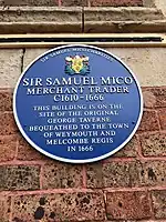 Mico owned the George Inn on Weymouth Quay, which he stayed in when he was in the town. His will dated 25 September 1665 left money to the people of Weymouth, to provide for the apprenticing of three boys,[4] the payment of a pension to ten seamen who had reached 60 and the preaching of an annual sermon at a service to be held of the Friday before Palm Sunday each year at which trustees, apprentices and seamen should attend. The money which was invested together with the income from the rental of The George Inn, still funds a charity today that follows Mico's wishes called the Sir Samuel Mico Charities[5] which is managed under the umbrella of Weymouth Town Charities.