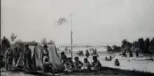 Along the Arkansas River, they came upon an encampment of Arapaho, Cheyenne, Kiowa, and Kiowa Apache. Seymour captured the image of the Native American chiefs crossing the river to the expedition's campsite to meet with Captain John R. Bell.[23] Over three weeks, Captain Bell's party traveled down the Arkansas River and saw Arapaho heading out to do battle, Comanche returning with their wounded after a fight with the Otoes, and Cheyenne after they raided a group of Pawnee. There are no surviving illustrations by Seymour of this time.[24]