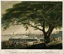 Seymour completed five panels in 1795 for the American edition of the Encyclopædia Britannica printed by Thomas Dobson.[4] He established himself in Philadelphia by 1796,[5] where he was an engraver and painter through 1822.[3][6] He was a colleague of Thomas Sully[7] and made engravings of William Birch's work in 1801, 1803, and 1804.[5] Reconstruction following the occupation of British military during the American Revolutionary War was completed by 1803. Birch and Seymour worked together to create two variations of an illustration of Brooklyn Heights on a single engraving plate. Both depicted churches attended by diverse populations of people, including the Middle Dutch Church, St. Paul's Chapel, Trinity Church, and Presbyterian Church. Ships were moored on the river. A second version included picnickers and a grazing horse in the foreground. Prints from the engravings were hand-colored.[8] His engraving of Thomas Birch's Philadelphia, taken from Kensington drawing of 1811 is among the collection of the Philadelphia Museum of Art.[2]