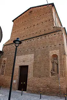 The simple brick facade is decorated with a diamond point pattern; the main portal is flanked by statues of St Bernardino da Siena and St Giacomo della Marca sculpted in 1765 by Carlo Sarti. He also completed the St Francis of Assisi in the niche in the right rear corner of the church.[1] The main altar has angels with the Franciscan symbols (1758-1759) sculpted by Sarti.