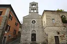 The church is ancient, and was previously known as Sant'Ilario. By 1112 we have documentation of a church belonging to the Benedictine Abbey of Farfa. A stone at the left of the entrance recalls a consecration in 1249.[1] In 1623, the church was granted by the bishop to a Confraternity of San Carlo, where it gained its present name.[2] The austere stone rectangular layout of a single nave, with few windows is accounted for the early Romanesque construction. In the following century, the few added decorations, including the two story sail-shape bell-casing with mullioned arches as well as the small rose window, exemplify gothic architectural details from the late 12th century. The interior is equally sparse, and best lit through the rose window by the rising sun in the morning. Inside there is a damaged fresco of the Madonna della Misericordia by Giovanni Spagna, and two canvases depicting San Carlo Borromeo and Sant'Ilario. The latter was painted (1640) by Bartolomeo Barbiani.[3]