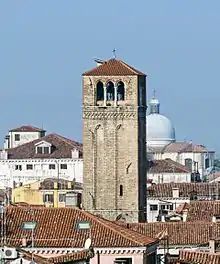 The church has a 13th-century campanile which was modified shortly after with the addition of a Gothic belfry. On the side facing the water is a door which formerly had a porch (portico), a feature which was demolished in the 19th century. The church is typically described as having the appearance of a "big box" with buildings close by and overlapping on several sides.[2] Unlike many churches in Venice it has no facade and overall the exterior is plain and unadorned. A feature which may possibly have been retained from the original church is the door jambs or doorposts, which date back to the Byzantine era. Entry to the church is usually through a side door in the wall facing the Campo San Cassiano.[2]