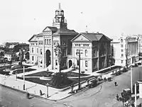 The second county courthouse was completed in 1872 on land donated by Alonzo Horton in "New Town" San Diego.[4] It was replaced by a third county courthouse which was completed in 1892. The 42 clerestory stained glass windows featured the Great Seals of each state in the union at the time of its completion, and were saved after the courthouse was demolished in 1961.[5] The 1892 structure was built at the corner of Front and D (now Broadway) in downtown San Diego after the architects hired to expand the 1872 courthouse (Nelson Comstock and Carl Trotsche) determined the structure could not support the new proposed wings.[4]