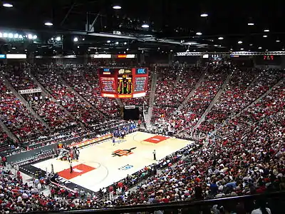 The Aztecs play their home games at Viejas Arena (formerly Cox Arena), which is located on the west side of campus on the footprint of the former Aztec Bowl, where SDSU football played its home games from 1935 to 1966. Viejas Arena opened in 1997 as Cox Arena and seats 12,414 for basketball games.[8] In 2009, the Viejas Band of Kumeyaay Indians purchased the naming rights for ten years.[9] The arena features an octagonal scoreboard with video-replay system, that includes up-to-the-minute statistical information on individual players.[9] The facility is also equipped with seven locker rooms, two of which are complete with team rooms, equipment rooms, and a shared training room.[9]