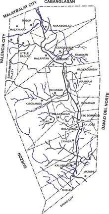 The municipality's Poblacion is 31 kilometres (19 mi) from Valencia City and 71 kilometres (44 mi) from Malaybalay City.