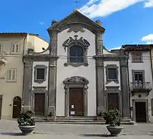 This church was erected in 1631. It was later enlarged to add two naves to the side. The facade pilasters, frames, and roofline were made of pietra serena, a grey local sandstone. The weathering of the elements creates an illusion of melted stone. While baroque in epoch, the asymmetries caused by the weathering, and the stylized frames align the church with mannerist design prevalent in Tuscany.