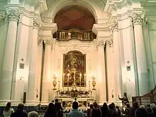 The facade has a wooden statue of St Francis. The main altar (1755) has a canvas depicting Christ and the Virgin granting indulgences to St Francis (1773) by Francesco De Mura. The sacristy has a canvas depicting Conversation with the Crucifix by St Thomas (1580) by Marcus Laurus, held in lunette frescoed with the Virgin with St John the Baptist and St Michael Archangel. The musical organ dates to 1721.[1]