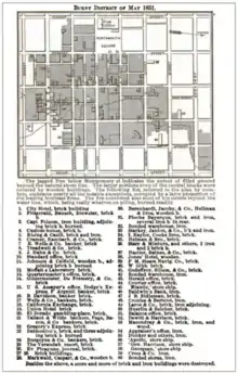 The fire, which was visible for miles out to sea, continued for about 10 hours and eventually extended to at least 18 blocks of the main business district, an area three-quarters of a mile long by a third of a mile wide.[1][4] Before it was checked by reaching the waterfront, it burned down some 2000 buildings altogether, amounting by some estimates to three-quarters of the city.[1][2][3] One 19th century account of the destruction observes: "Nothing remained of the city but the sparsely settled outskirts."[4] The total damage has been estimated at around $10–12 million, a good deal of it uninsured as no insurance companies had yet been established in the city.[4][5]