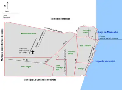 San Francisco is divided into seven parroquias, of which San Francisco serves as the capital of the municipality. The newest parroquia is José Domingo Rus, which was created in 2006.[5]