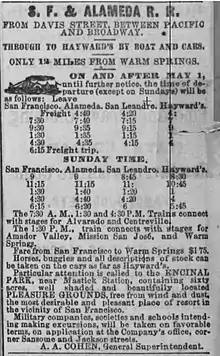 In 1863 A. A. Cohen,[1][2] a prominent San Francisco attorney, together with Charles Minturn, an operator of river steamboats and bay ferries, E. B. Mastick, a prominent Alameda landowner, and others incorporated the San Francisco and Alameda Railroad to provide passenger and freight ferry-train service to Alameda, San Leandro, Hayward (then called Haywards) and perhaps farther.[3][4]