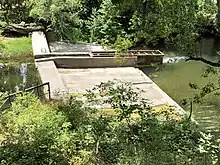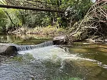 The Lagunita Diversion dam was the most significant barrier to fish passage, because it was located on the mainstem San Francisquito Creek, blocking upstream salmonid migration to all San Francisquito Creek tributaries in lower rainfall years. It was located just north of the east end of Happy Hollow Lane near Alpine Road and near the Stanford Weekend Acres neighborhood in unincorporated Menlo Park. This dam was originally constructed in 1899–1900 to divert winter flows to fill Stanford's Lake Lagunita.[31] It is located 13 mile (0.54 km) downstream of the mouth of Los Trancos Creek but stopped diverting water to fill the artificial lake when the San Francisquito Creek Pump Station (23 mile (1.1 km) further downstream) took over this task in 1998.[36] A fish ladder was constructed on the Lake Lagunita Diversion Dam in 1954, however despite re-modification it remained impassable in low rainfall years. In 2014 Our Children's Earth Foundation sued Stanford for allegedly violating the Endangered Species Act, saying the dams obstruct steelhead trout from swimming upstream to freshwater habitats necessary in the early stages of their life cycle. They also registered concern about the Jasper Ridge Road Crossing as another barrier to fish passage. The Jasper Ridge Road Crossing was a concrete weir (low dam) built along a dirt road that crosses San Francisquito Creek shortly downstream from the confluence of Corte Madera and Bear Creeks. The Jasper Ridge Road Crossing blocked the passage of steelhead upstream and downstream during lower flow conditions that begin in the spring and prevent smolt outmigration in late spring, as well as immigration of spawning adults in dry winters. In 2015 Stanford denied that the court had ordered them to remove the Lagunitas Diversion Dam and maintained that it had been planning to remove that dam since its 2010 Habitat Conservation Plan and had initiated the engineering and hydrology work to prepare for removal.[37] In December 2017 Stanford received a $1.2 million ecosystem and watershed restoration grant from the California Department of Fish and Wildlife which covered 30% of the costs of dam removal and riparian restoration. By late 2018 Stanford removed the 119-year-old Lagunita Diversion Dam and restored 480 feet (150 m) of the creek, improving fish passage with pools, shallows and native plants, and moved the creek eastwards away from the residential area.[38] In addition, Stanford replaced the Jasper Ridge Road Crossing weir with a bridge, opening 6.6 miles (10.6 km) of unimpeded access to the Bear Creek mainstem, and its tributaries such as West Union Creek, to salmonid spawning runs.