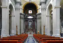 In 1634, the Baroque painter and architect Pietro da Cortona was asked by the Florentine nobleman Orazio Falconieri to design the high altar.[6] Drawings for the altar and its setting and a model were prepared but the project was not carried out. Cortona's ideas for the choir included windows hidden from the view of the congregation that would illuminate the altarpiece, an early example of the Baroque usage of a "hidden light" source, a concept which would be much employed by Bernini. Some twenty to thirty years later, Falconieri resurrected the choir project but gave the commission to the Baroque architect Francesco Borromini, who changed the design to allow for the burial of Orazio's brother, Cardinal Lelio Falconieri. After Borromini's death in 1667, the work was completed and partly modified by Cortona and, on his death in 1669, by Ciro Ferri, Cortona's pupil and associate.[7]
