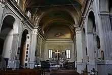 The mighty bell tower dates back to the mid-11th century. The construction uses various materials of Roman origin with decorative intent, especially in the part next to the belfry.[5] Immediately on the right there is a part of the ancient baptistery annexed to the church, and in the first chapel, also on the right, there is an altarpiece, painted by the Milanese Giovan Battista Sassi, which depicts Saint Andrew Avellino dying in front of the altar. In the lunette of the presbytery there is a fresco with the Eternal Father by Federico Faruffini.[6]
