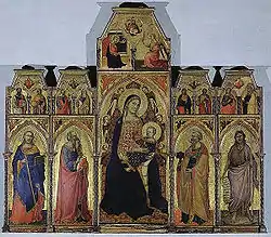 In the presbytery is a polyptych by Taddeo Gaddi (1350–1353) depicting the Virgin with Child with the Saints James, John the Evangelist, Peter and John the Baptist. Over the main figures, inscribed within Gothic-style small arches and twisting columns, are other figures of saints; in the upper frame is an Annunciation within a mullioned window, surmounted by the Eternal Father.