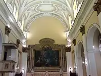 The church was founded in 1434, but little of the medieval structure remains. Numerous reconstructions, most recently 1992, have altered the plan. The original entrance was on the opposite side; the canvas of Solimena was on the counterfacade. With the alterations in city streets, the church was altered, and left with a simple facade. In the interior, on the right is visible a spherical shrapnel walled into the external facade during the bombardment of World War II. The polychrome altar has been stripped of some of its sculptural and painted decoration, it retains two 16th century bas-reliefs representing Motherhood. The main altar hosts a large canvas by Francesco Solimena depicting the Glory of Mary with Saints (circa 1705).