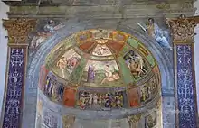 The façade was erected after 1520, and construction continued until 1733. The apse shows traces of the Romanesque architecture of the original church. The small church is best known for two chapels with Renaissance-style frescoes, including a shallow Caetani chapel with frescoes by Girolamo Siciolante. [1][2]