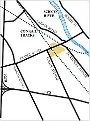 Neighborhood boundaries between Penn Central and Conrail train tracks, following Trabue Road and venturing south until 1600 Hague Avenue. The Saint Margaret of Cortona Catholic Church parish boundaries extend north to Roberts Road, east to the Scioto River, south to Fisher Road, and west to Jones Road.