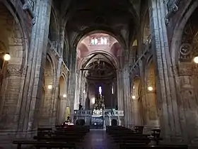 Archeological evidence, such as Ostrogoth silverware found at the site in 1968, suggests the site may have housed an early Christian basilica dating to the fifth century. The silverware is now preserved in the Pavia Civic Museums.[1] Between 662 and 671, a church was built at the desire of King Grimoald. Dedicated to St Michael, it was built on the location of the Lombard Palace chapel. This church was destroyed by a fire in 1004, and only the lower part of the bell tower dates to the 7th-century church. The construction of the current crypt, choir and transept was begun in the late 11th century and was completed by 1130. The vaults of the nave, originally with two grossly squared groin-vaulted spans, were replaced in 1489 by the design of master architect Agostino de Candia[2] in four rectangular spans, and the structure was created by his father the renown Pavia master mason Iacopo da Candia.[3]