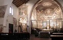 On the right wall, there is a Madonna of the Rosary and Saints by Enea Salmeggia and in the counterfacade, two frescoes by Antonio Cifrondi depicting Christ and the adulterous woman and the Last Supper. The crypt has 13th-century frescoes, and one of a Enthroned Madonna and Saints, attributed to Antonio Boselli.