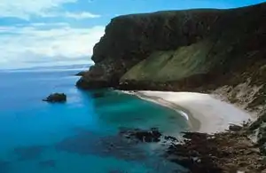 San Miguel Island (Chumash: Tuqan)[1] is the westernmost of California's Channel Islands, located across the Santa Barbara Channel in the Pacific Ocean, within Santa Barbara County, California.[2] San Miguel is the sixth-largest of the eight Channel Islands at 9,325 acres (3,774 ha), including offshore islands and rocks. Prince Island, 700 m (2,300 ft) off the northeastern coast, measures 35 acres (14 ha) in area. The island, at its farthest extent, is 8 miles (13 km) long and 3.7 miles (6.0 km) wide.